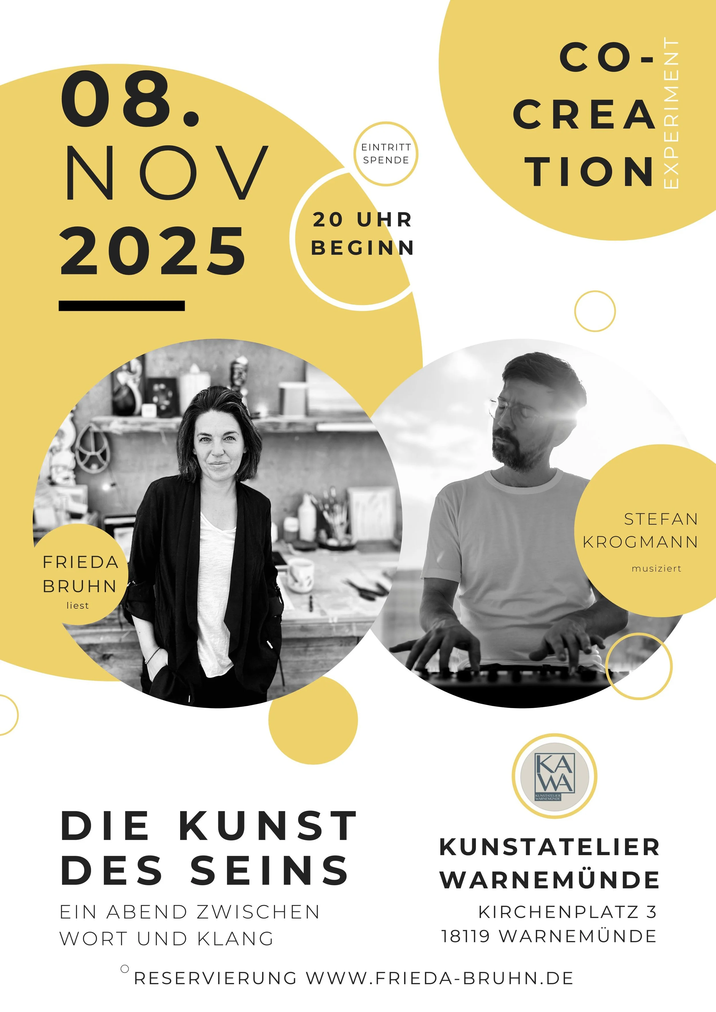 Ein Abend zwischen Wort und Klang. Zwischen Gedanken und Gefühl. Frieda Bruhn und der Singer-Songwriter Stefan Krogmann laden zu einem inspirierenden Abend über die Kunst des Seins, Kreativität und das schöne gesunde Leben ein. Worte, Musik und Stille verweben sich zu einem gemeinsamen Erleben – ehrlich, berührend und tief.
